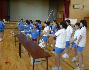 昔の狩りを体験する弓矢とばし、女の子も夢中になっています。