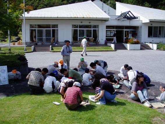 縄文時代の食べ物の話を聞き、石器でクルミを割ってみました。