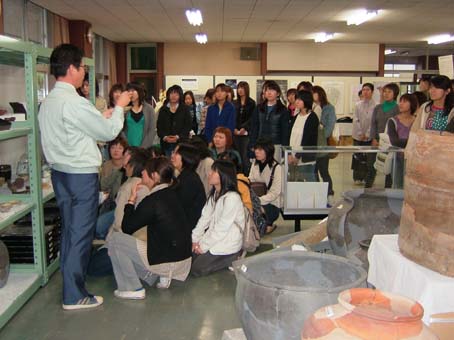 日本史学科の1年生、総勢58名が、当センターで史学実習(学外実習)を行いました。この特別収蔵室では、県内各地から出土している遺物について解説を行っています。