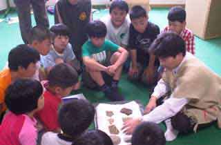 | 東小学校は、上山市の東部奥羽山脈の麓の学校です。この地区には、山形県内を代表する縄文時代中期の遺跡「牧野(まぎの)遺跡」があります。山形県史にも取り上げられているこの遺跡を授業に生かしました。 今回の出前授業は、総合学習の一環での、コース別体験学習の1コースとして行われました。普段の出前授業とは違い、1年生から6年生まで学年オープンで14名の参加のもと多彩な活動が繰り広げられました。学年を越えて活動する子供たちの姿は真剣そのものでした。 |