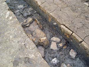 | 遺物出土状況(A区) 縄文時代の遺物包含層をさらに掘り下げました。下層から土器が出土しています。 |