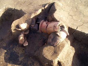 土器が大量に残っていたカマドを慎重に掘り進めているところです。これまでこの狭いカマドの中に詰まっていた5個体分ほどの土師器の甕をとりあげました。カマドの構築材に使われていたと思われる土器だけを残していきます。 |