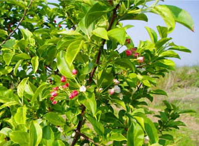 調査開始の日、調査区わきのりんごのつぼみがほころび、可憐な花を咲かせました。このりんごが大きな赤い実になる頃まで、発掘調査は続けられます。 |