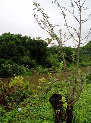 調査が始まった頃に開花したりんごの実が、もうこんなに赤くなってきました。道具洗い場の近くではコオロギも鳴いています。8月末というのに、すでに秋の気配です。 |