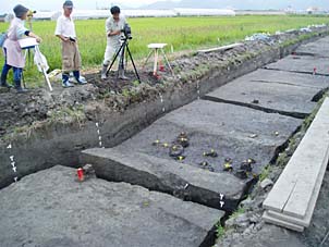 | 1区東側河川跡 1区の東側には現代の水路跡・近代の水路跡・古代の河川・古墳時代の河川の4本の河川が複雑に絡み合いながら検出されています。調査はさしずめ、絡まった糸をほどくような雰囲気です。 |