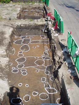 9区の遺構検出 中央の黒い部分が元禄の絵図にある水路跡です。現在も水路として使われています。 |