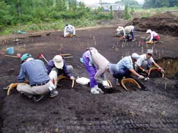 | 黒色土を手作業で少しづつ掘り下げていき、見つかった遺物は動かさないように残しながら掘り進めます。 | |