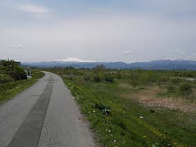| 晴れた日に撮影した月山と葉山です。月山 には雪がまだ溶けずに残っています。本格 的な遺構検出は来週からになりそうです。 |