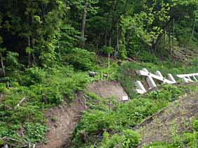 カモシカの親子現る 6月2日の朝、現場北側の工事区域西端にカモシカの親子を発見、皆でウォッチングやら写真撮影やら騒いでも逃げず、ラジオ体操の間ものんびり朝食タイムしていましたが、工事現場の重機の音に驚いたのか山の中へ逃げていきました。(ちなみに写真には写っていませんが、もう1頭白いカモシカも木立の中に見えました。) |