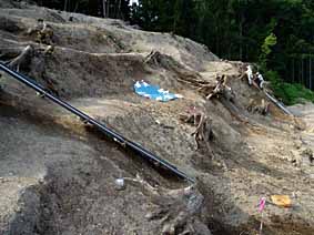 こんなところも面整理 写真でお分かりのように、「斜」面整理の様子 です。調査区の一番下は崖状になっているの で、足を踏ん張らないとズズズと滑り落ちてい きます。前かがみでジョレンや根切り鋏を持ち、 上り下りもつかまるところがないので、足が疲 れます(でも細くはならないのが悩みの種です?) |