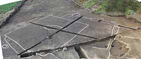 連結部分の遺構検出のようす 表土を剥いだ跡、溝を入れるなどして調べた結果、写真のように住居跡と溝跡の続き、柱穴跡、土坑などが見つかりました。 |