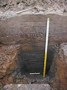 遺跡の地形を調べるため深掘りもしました。 ※河川堆積の泥炭の上に砂層が堆積しています。 |