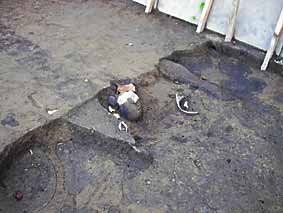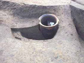 住居跡は中央部までほとんど床面完掘の状態まで調査が進みました。主にカマド周辺から遺物が出土しています。 写真は支脚として使われたと考えられる甕で、逆さにふせた状態でカマド中央から出土しました。 |