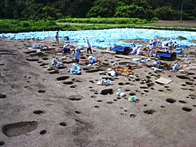平成13年度調査区中央南側精査状況 南側からやや北へ移って遺構を掘り始めました。下の段も柱穴が集中しています。 |