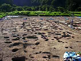 調査区前景 掘立柱建物跡にテープを張る。 |