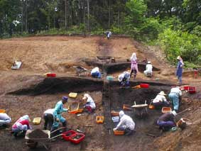 作業風景 (5月31日) 今週で灰原の大半を掘り進め、土器は整理箱に48箱出土しました。(北から撮影) |