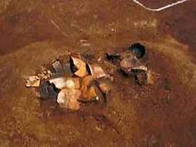 内黒長胴甕・坏、須恵器小壺出土状況 長胴甕の下部に火を受けた痕跡があります。 |