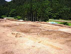 竪穴住居跡が見つかりました 南東から撮影しました。 10棟あまりの竪穴住居の跡がありました。その多くは北東側に集中しています。この地区からは6棟の住居跡が重なった状態で見つかりました。 |