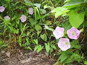 遺跡に咲く花シリーズその5 ヒルガオ〔昼顔〕 ヒルガオ科 学名:Calystegia japonica 調査事務所前の農道沿いや、調査区周辺で見かけられます。朝に咲き、日中の強い陽射しの中でも可憐なピンクの花を咲かせ夕方には閉じます。朝、私たちを迎え、日中、共にがんばり、夕方、お疲れ様と送ってくれているようです。 |