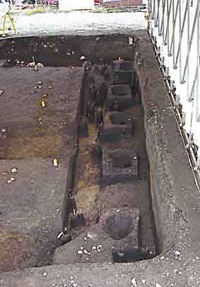 溝跡SD58完掘状況 北西から 石組みの水路跡が確認できました。 |