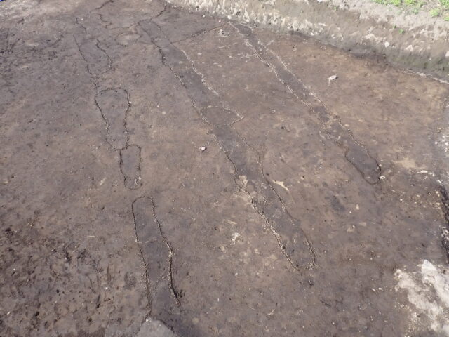 1区では調査区の半分に到達しました。遺構が見つかっています。
