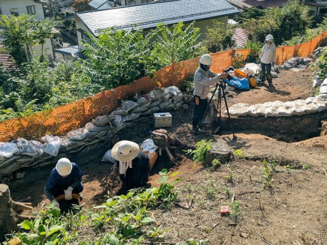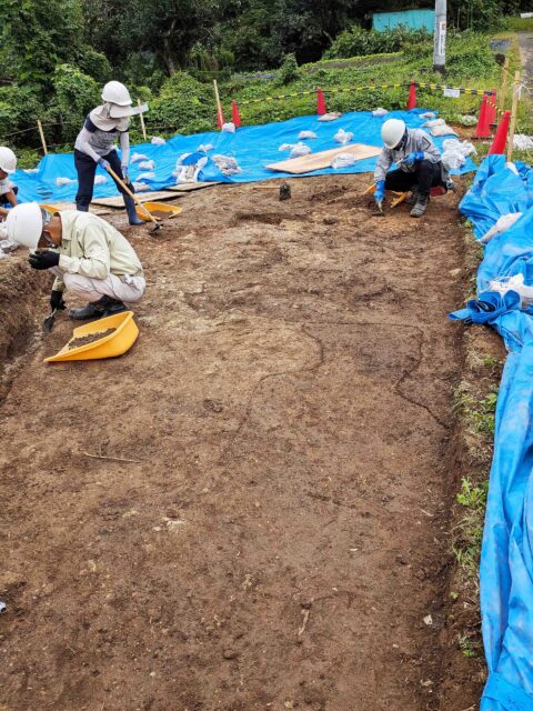 表土を剥ぎ、トレンチを入れて地層の様子を確認していきます。