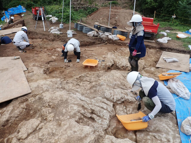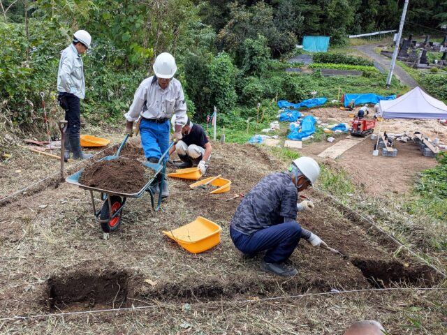 2025(R7)年度, 発掘調査速報, 飯田館跡 飯田館跡(10月6日~10日) 2025年10月17日 yamagatamaibun 今週は東側調査区の空撮を行う予定のため、地表をきれいに整える作業から始まりました。 調査がはじまってから2回目の空撮の様子です。 5区の縄張りを行い溝を掘り、面整理に着手しはじめました。表土から須恵器の破片が見つかりました。 Tweet