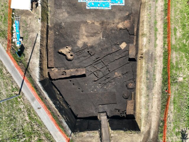 調査区南側で見つかった溝跡などの調査が終了したのでドローンを使って空撮を行いました。溝跡が同じ方向に向かって延びていることがはっきりとわかります。