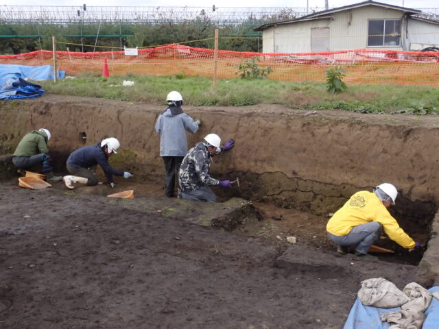 調査区中央部分では竪穴建物の調査を進めました。調査区の壁をきれいにして、土が堆積している様子を確認しています。