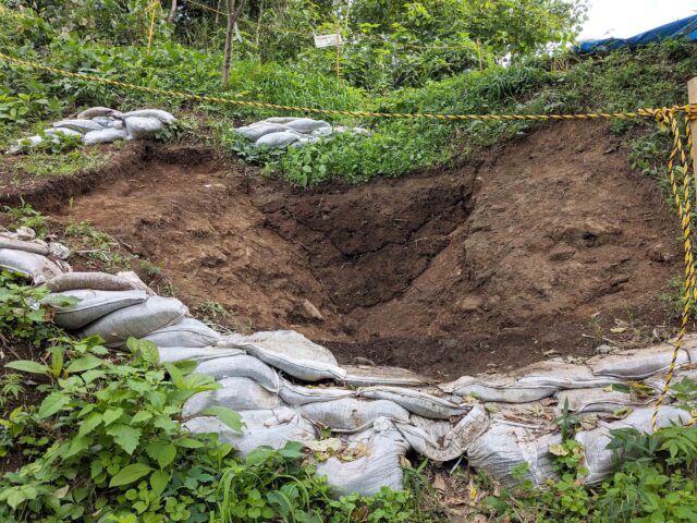 遺跡の中央に位置する水路跡を調査しました。重機を使用した跡がないため、当時の人が手掘りで岩盤を削り造ったようです。